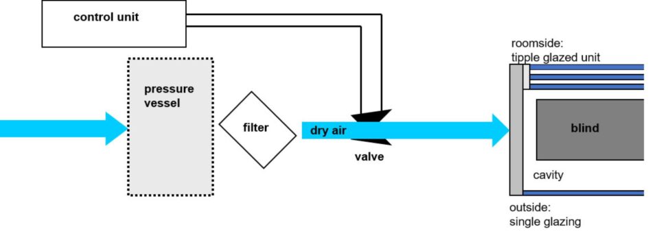 The construction principle is based on a 2-shell element façade system consisting of interior insulating glazing and impact discs on the street side. The façade cavity is almost completely sealed and has no constructed openings inward or outward. To prevent condensation on the surfaces in this dense cavity under different weather conditions, this cavity is supplied with preconditioned dry air. The air supply is centralized using compressor air, and dry air is transported to the façade elements via vertical and horizontal distribution lines with slight overpressure.