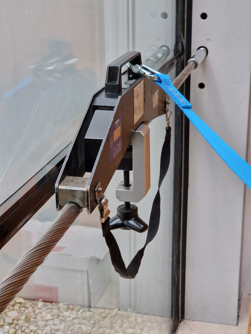 Access to the wire structure was provided via double doors at the rear of the building. Due to space limitations, a spider lift was used to reach the necessary height. Our Structural Engineers performed the measurements using a specialized tension measurement device. Precise readings were taken on both the horizontal and vertical tension wires.