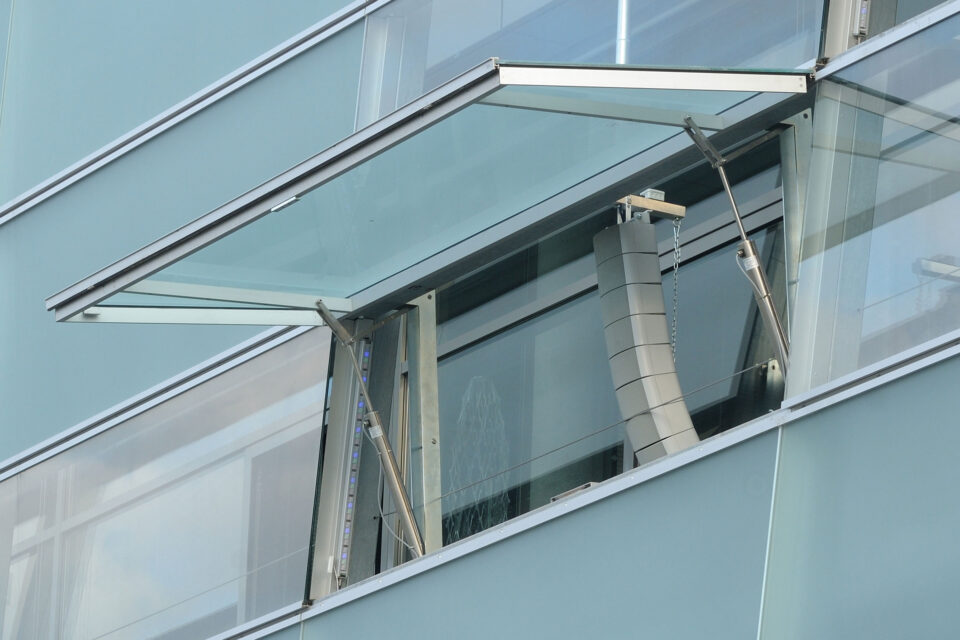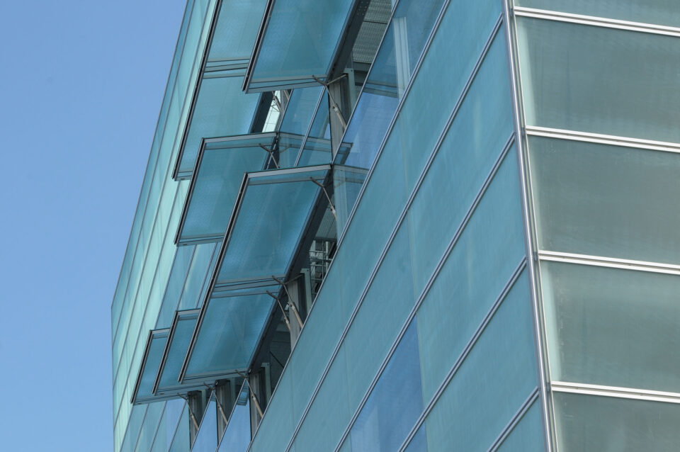 The Ars Electronica Centre has one of Europe’s largest illuminated façades. The building has a double-skin façade which is designed as a multimedia design surface. The approximately 5,200 m² inclined media façade consists of 1,100 glass elements, which are fitted with 40,000 LEDs. The glass surfaces are partly transparent and partly translucent and backlit form the façade cavity. The ventilation of the cavity is effected by 1.3 m x 3 m wide top-hung windows with actuators developed by GIG. The lights behind the glass panes can be controlled individually, so the appearance can continuously be varied on both, brightness and colour mix.