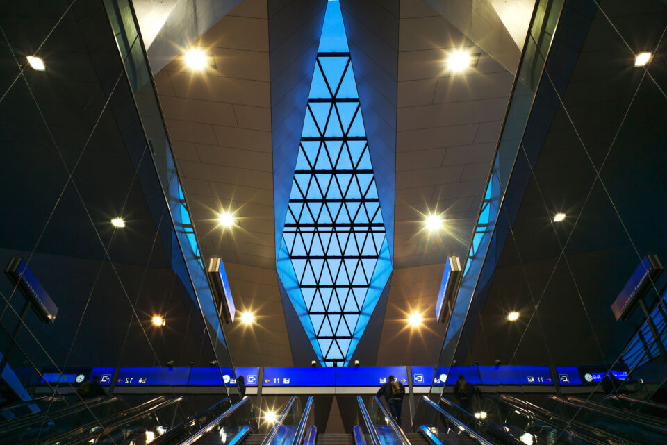 The glass louvres embedded in the façade areas between the train platform canopies are motorised and can be used for natural ventilation and besides the daily ventilation they provide quick heat extraction in case of fire.
