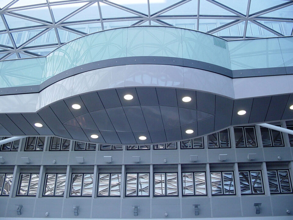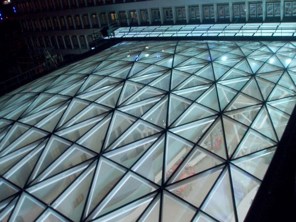 The entire atrium roof was delivered in prefabricated sections and assembled on a working platform at the final installation height with millimetre precision. It was then lowered onto the underlying supporting steel structure. The glass panes were bonded onto the framework in their exact position. Finally, the surrounding joints were sealed with silicone.