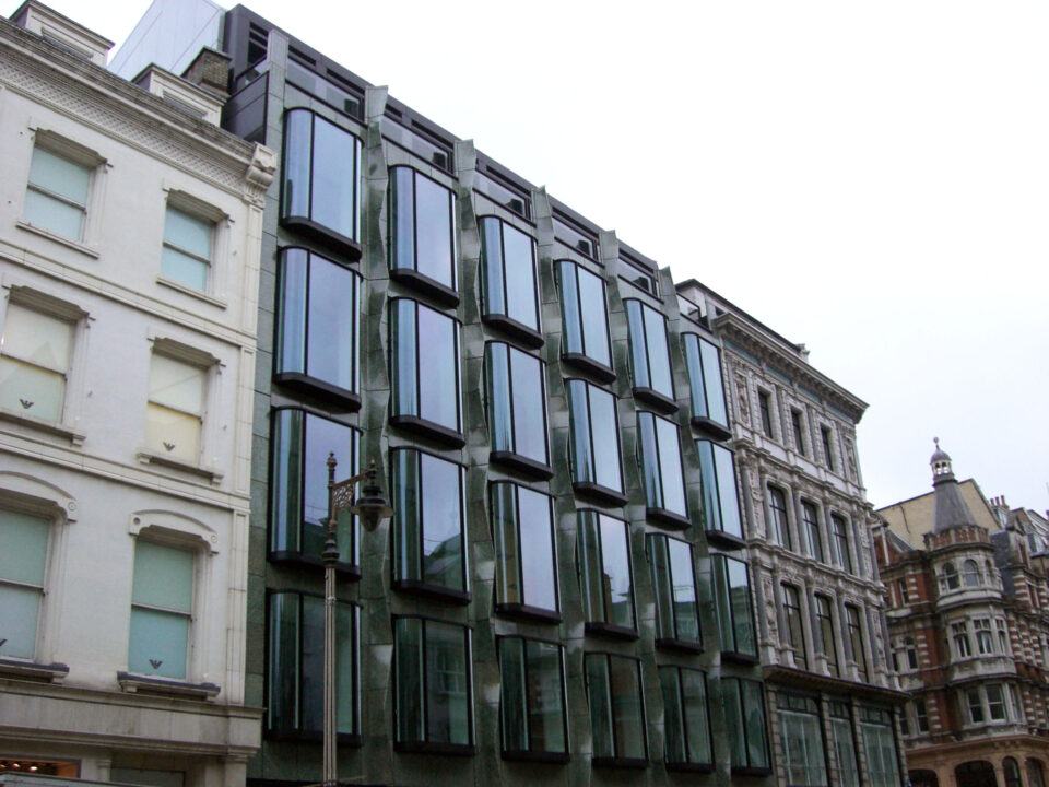 This project involves the renovation of a building block, where various sections and façades are listed, while others were completely demolished. The façades of the resulting infill buildings were designed, produced, and installed by GIG. These are predominantly unitized façades of the GIG 94 series, which blend into the appearance of the surrounding buildings on the main streets of New Bond Street and Maddox Street. The visually defining components of the façades are bay windows and glazed terracotta on New Bond Street, as well as glass blocks and aluminium cladding on Maddox Street. The building with the largest usable area is in the courtyard of the block and is not visible from the outside. This building also features GIG 94 series unitized façades with timber, stainless steel, and aluminium curtain walls.