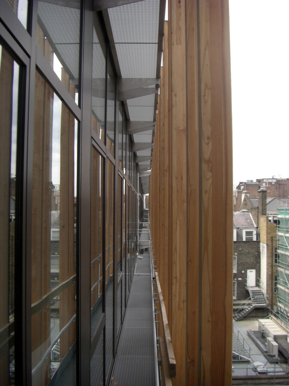 Due to the exclusive location of the building—New Bond Street is the most expensive shopping street in London—with correspondingly high rental prices, and as a result the steel structure was set to the outer edges of the building to gain valuable space. This presented a significant challenge, as our unitized façades were repeatedly interrupted by the steel structure.
