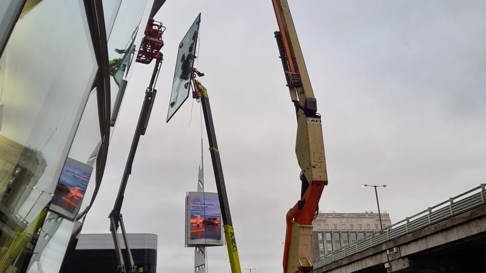 These replacements often involve complex access requirements, utilising Mobile Elevating Work Platforms (MEWPs) and Spider Cranes. Our team carries out each installation with meticulous planning and expert coordination to minimise disruption to the client’s operations.