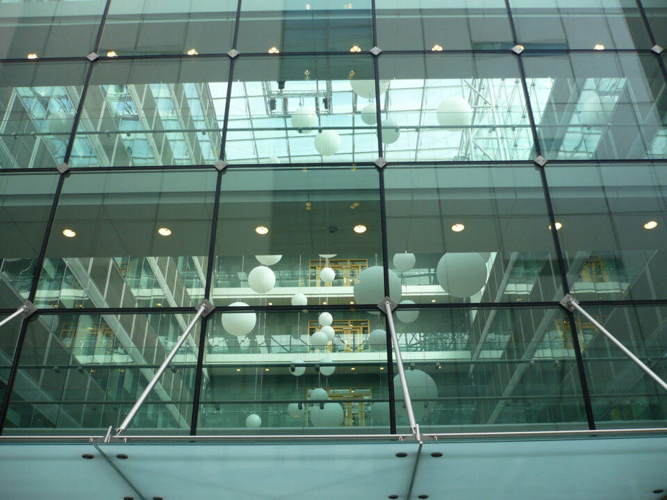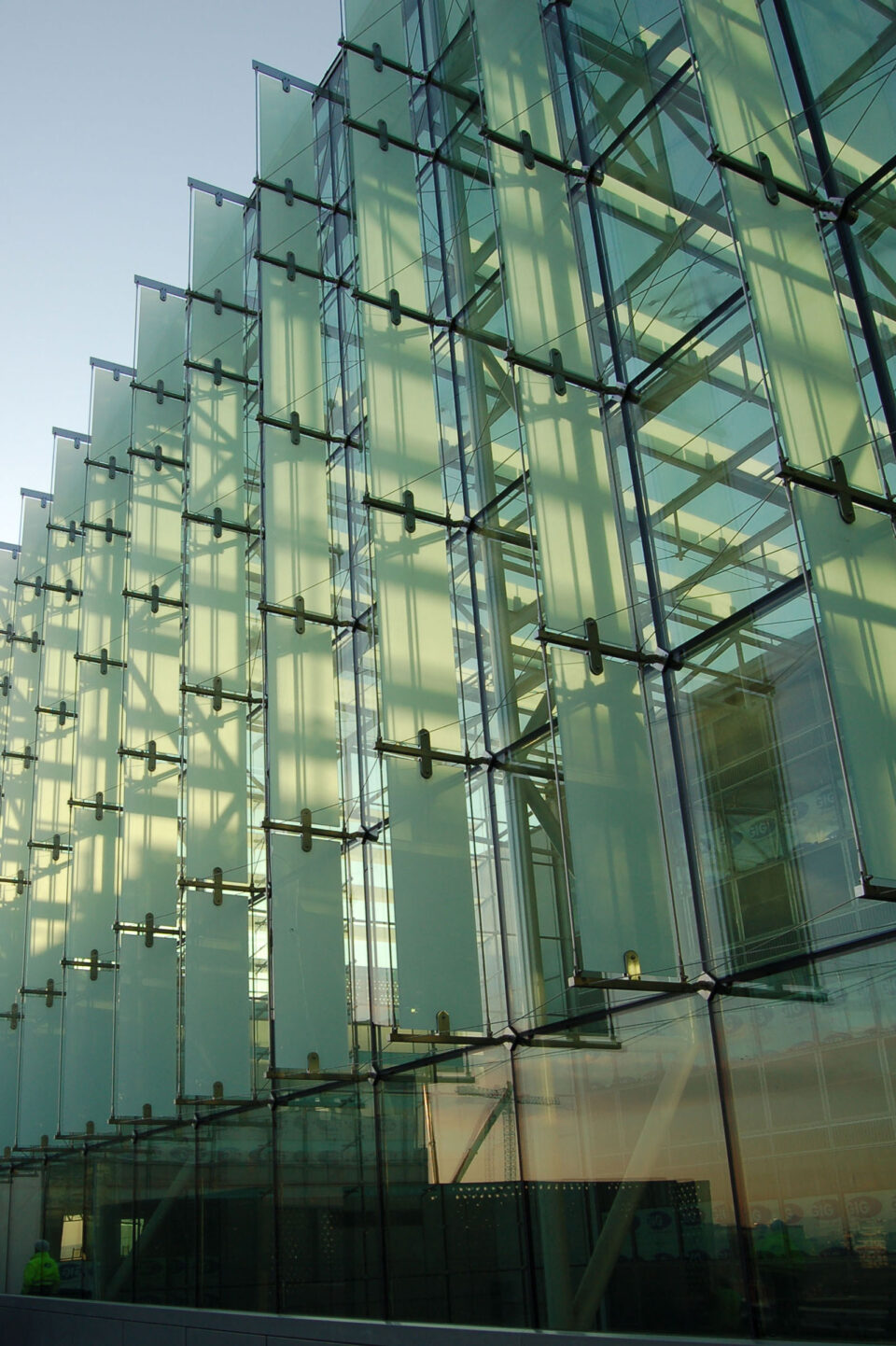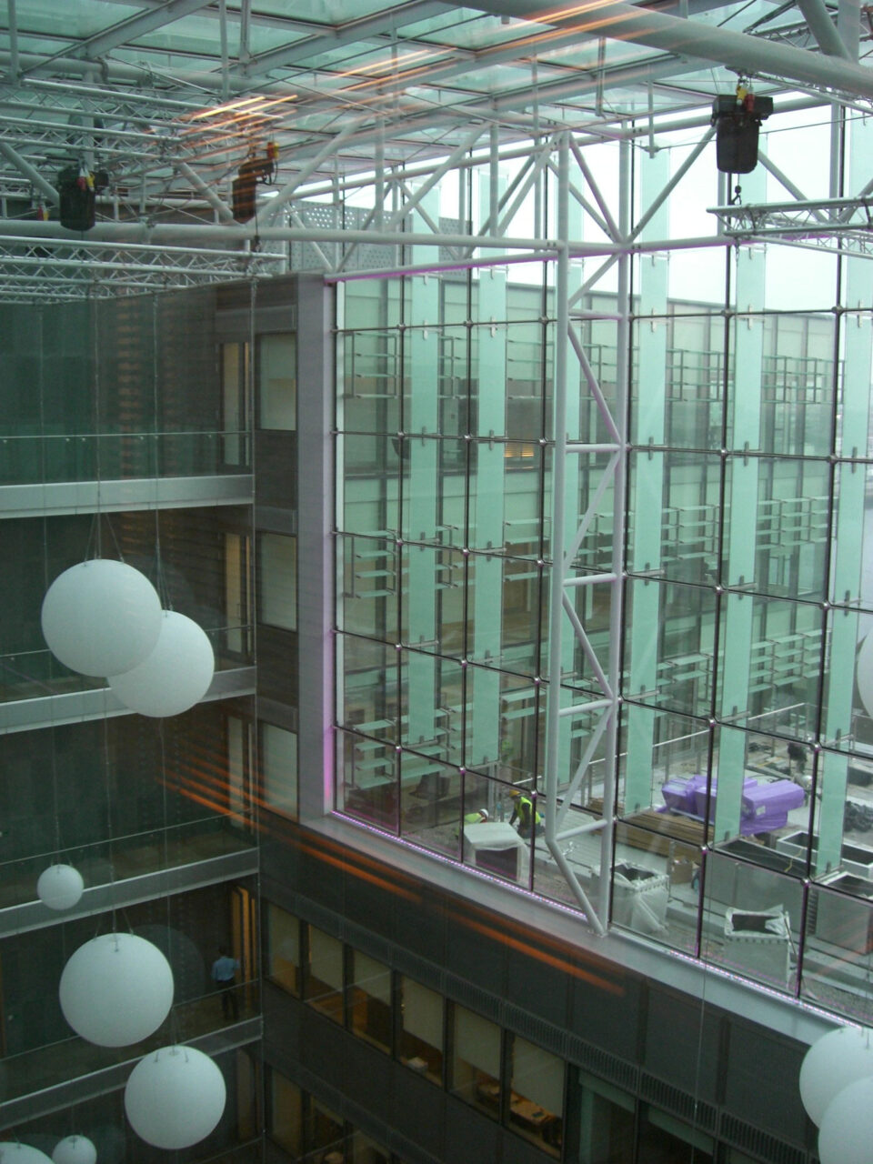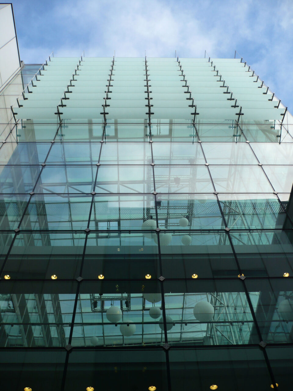 The building is comprised of three blocks and the roughly 22,000 m² façade consists of differing solutions. From the majority of the quays, the striking façade of chessboard-like elements are transparent, and the atrium is also striking, as its outer skin is point-secured by means of a steel construction and stainless steel spiders.
