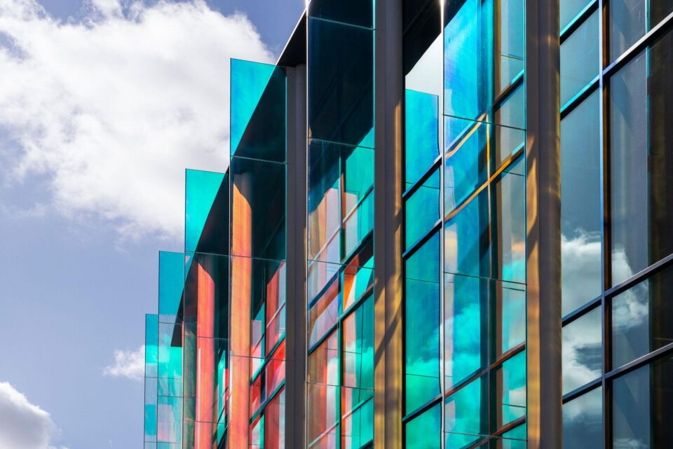 Die Verwendung von dichroitischem Glas (Farbeffektglas) in der Architektur bietet eine faszinierende Möglichkeit, Farbreflexionen und Lichteffekte zu erzeugen. Es besteht die Möglichkeit zwischen einer Dichroic-Folie und beschichtetem Glas auszuwählen, beide Optionen bieten unterschiedliche gestalterische und funktionale Eigenschaften. Bei den Verglasungen an den Fassaden konnten für den Ölkonzern BP perfekte Farbspektren umgesetzt werden.