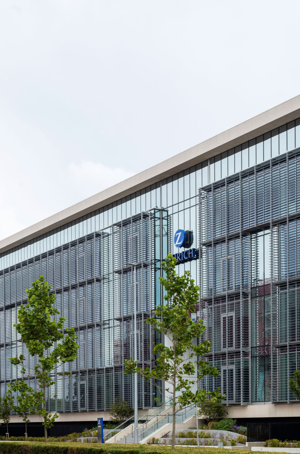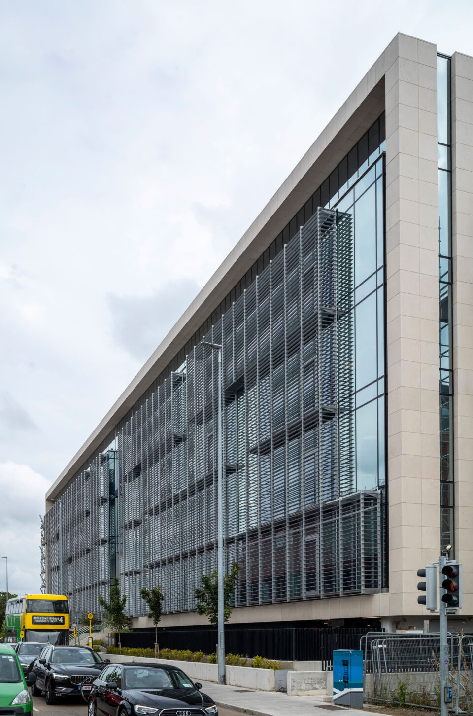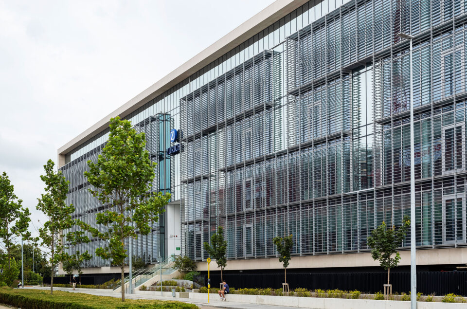 Die zur Straße gerichtete Seite besteht aus 1.600 m² Pfosten-Riegel Fassade mit 1.100 m² Aluminium-Brise Soleil als Vorsatzkonstruktion.