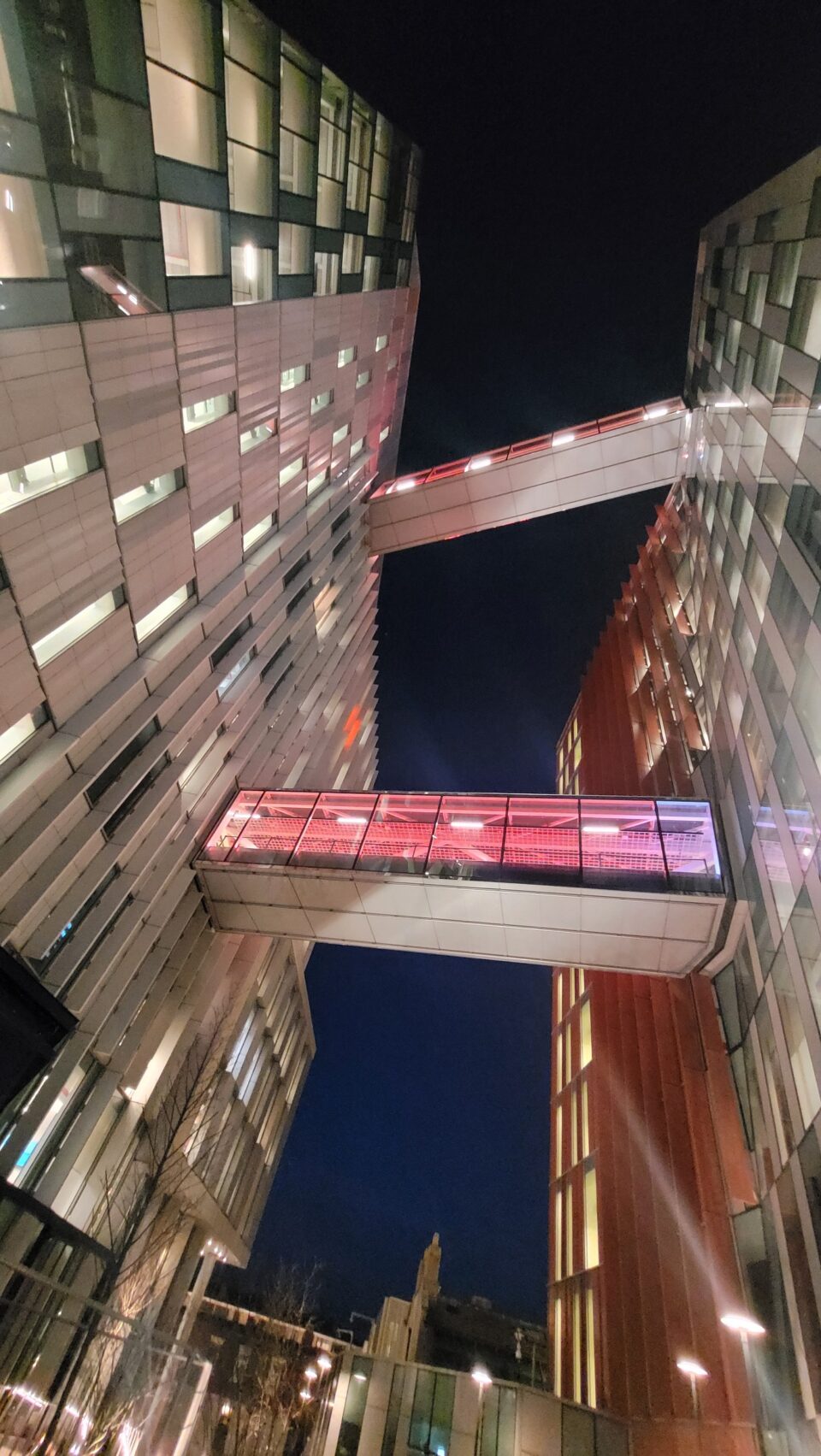 Vielleicht etwas weniger spektakulär, doch technisch nicht minder herausfordernd waren die Anschlüsse der Brücken an die zwei Bürotürme. In den geometrisch äußerst komplexen Anschlussbereichen wurde die bestehende Fassade demontiert und Teile davon später wieder eingebaut. Via 3D-Planung gelang es optisch nahtlose Übergänge und natürliche Dichtheit zu konstruieren.