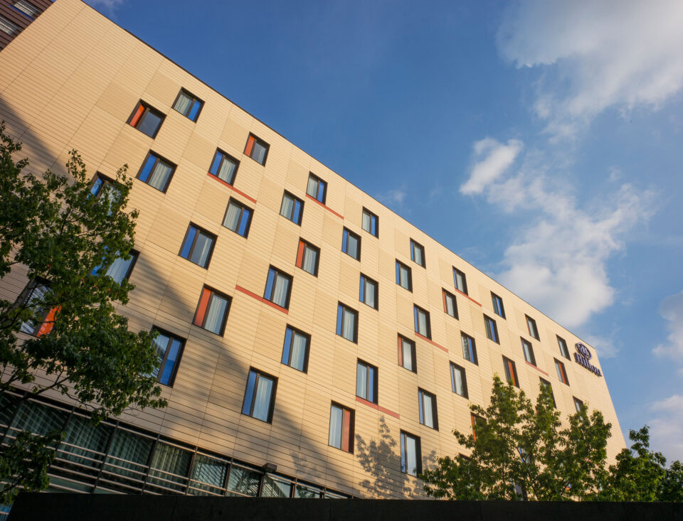 Luxus, Glanz und Glamour verbindet man mit dem Namen Hilton. Genau diesen Ansatz verfolgten die Architekten bei der Planung der Fassade, die einem prächtigen Abendkleid gleicht, das das Gebäude einhüllt. Terracotta und Kupfer, Glas und Aluminiumkonstruktionen, eloxiert oder pulverbeschichtet, wurden dazu in einem frischen Farbmix verwendet. Diese Materialvielfalt, sowie die extrem kurze Projektdauer stellten “die Herausforderung” für GIG bei der Umsetzung dieses Projektes dar.