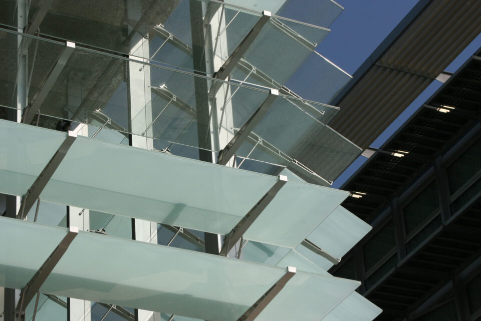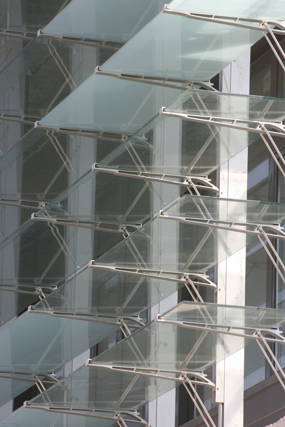 Ursprünglich waren vertikal stehende fixe Glaslamellen für die Beschattung des Gebäudes vorgesehen. Durch intensive Beratung konnte der Auftraggeber vom enormen Vorteile eines beweglichen Systems in Bezug auf die Klimatisierung des Gebäudes überzeugt werden. Wir erhielten den Auftrag zur Lieferung und Montage eines horizontalen glastec-Lamellensystems.